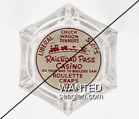 RRP-A1 Railroad Pass Casino Boulder City, NV 4 1/2" Clear Glass Ashtray Red on white imprint: Liberal Slots, Chuck Wagon Dinners, Railroad Pass Casino, On Your Way to Hoover Dam, Roulette, Craps, ''21'' |