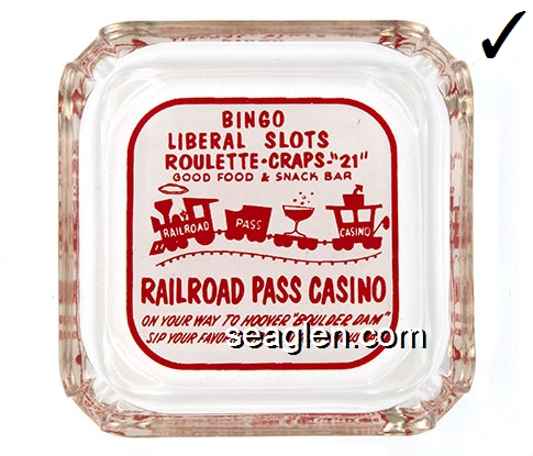 RRP-02 Railroad Pass Casino Boulder City, NV 4" Clear Glass Ashtray Red on white imprint: Bingo, Liberal Slots, Roulette - Craps - ''21'', Good Food & ... ''Boulder Dam'' Sip Your Favorite Drink at Our Famous Bar |
