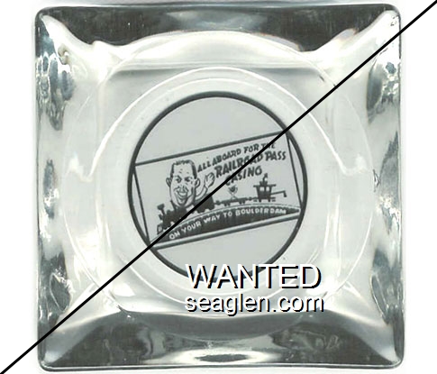 RRP-B1 Railroad Pass Casino Boulder City, NV 3 1/2" Clear Glass Ashtray Black imprint: All Aboard for the Railroad Pass Casino, On Your Way to Boulder Dam |