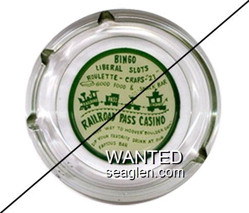 RRP-C1 Railroad Pass Casino Boulder City, NV 4" Clear Glass Ashtray Green on white imprint: Bingo, Liberal Slots, Roulette - Craps - ''21'', Good Food & ... ''Boulder Dam'', Sip Your Favorite Drink at Our Famous Bar |