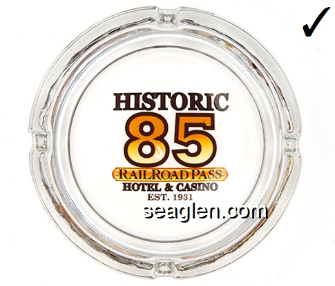 RRP-D1 Railroad Pass Casino Boulder City, NV 4" Clear Glass Ashtray Brown and orange imprint: Historic, 85, RailRoad Pass, Hotel & Casino, Est. 1931 |
