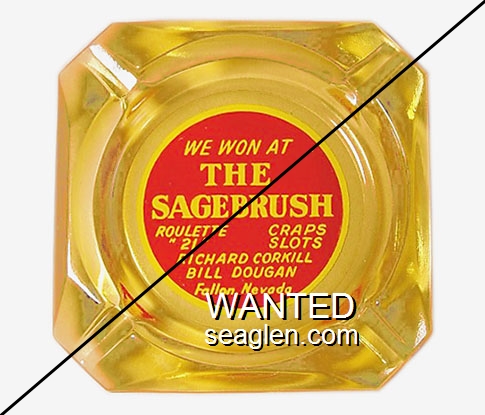 We Won At The Sagebrush, Roulette, Craps, ''21'', Slots, Richard Corkill, Bill Dougan, Fallon, Nevada - White on red imprint Glass Ashtray