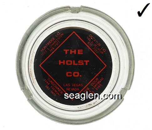 The Holst Co., Las Vegas, Nevada, Decatur Liq., 546 S. Decatur, 870-2522, The Door, 2442 E. Lakemead, 642-6565, Sundowner, 1444 Fremont, 382-5656, Huntridge Liq., 1122 E. Charleston, 384-7377 - Red imprint Glass Ashtray
