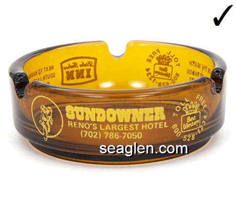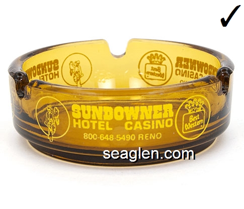 Sundowner Hotel Casino, (702) 786-7050 Reno, 800-528-1234 Reno, 800-648-5490 Reno - Yellow imprint Glass Ashtray