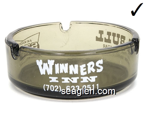 SJM-A1 Winners Inn/ Winners Hotel-Casino Winnemucca, NV 3 1/2" Smoke Glass Ashtray White imprint: Winners Inn (702) 623-2511, Red Bull, across from the Star, Downtown, Winnemucca, Joe Mackie's Star, Winn ... (Like SJM-09, except smoke glass) |