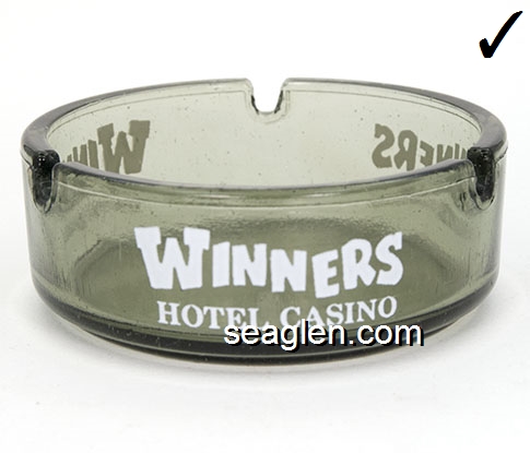 WIN-03 Winners Inn/ Winners Hotel-Casino Winnemucca, NV 4 1/2" Smoke Glass Ashtray White imprint: Winners Hotel Casino |