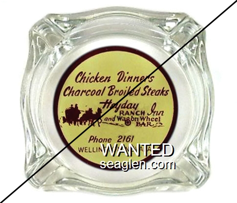 WWB-A1 Wagon Wheel Bar - Heyday Inn Wellington, NV 3 7/16" Clear Glass Ashtray Brown on yellow imprint: Chicken Dinners, Charcoal Broiled Steaks, Heyday Ranch Inn and Wagon Wheel Bar, Phone 2161, Wellington, Nevada |